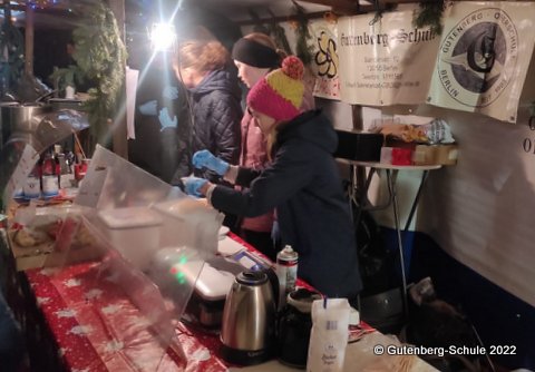Nach einer längeren Pause aufgrund der Pandemie fand am 27. November 2022 nun endlich wieder der Lichtermarkt vor dem Lichtenberger Rathaus statt. Die Gutenberg-Schule war dort traditionell mit zwei Verkaufsständen vertreten. Es wurden mit viel Liebe und Mühe durch unsere Schülerinnen und Schüler gemachte Spielsachen, selbstgebackene Kuchen und Plätzchen, die russische Suppe Borschtsch, Schaschlik, Zuckerwatte und vieles mehr verkauft. Die Stimmung hätte nicht besser sein können und mit der Hilfe von vielen Schülerinnen und Schülern sowie Lehrkräften wurden 1100€ für das Gomelprojekt gesammelt.