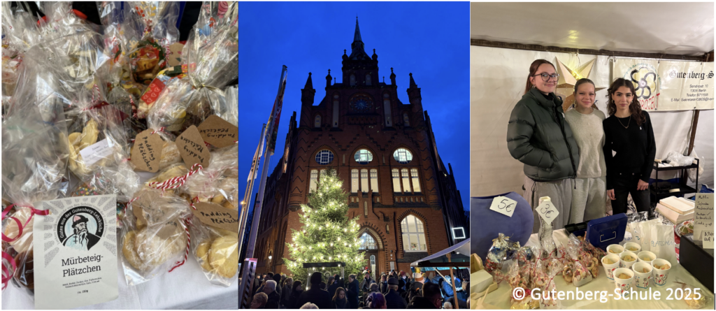 Am ersten Advent, dem 30. November 2025, präsentierte sich die Gutenberg-Schule erneut mit einem Stand auf dem Lichtermarkt in Lichtenberg. Wie in jedem Jahr sorgte der Markt für eine besonders stimmungsvolle Atmosphäre, diesmal bei winterlich-milder Frische und klarem Himmel. Es wurden zahlreiche selbstgebackene Leckereien aus den Back-AGs der Schule und Backöfen der Familien, zudem warme Speisen wie Soljanka und Waffeln angeboten. Zum Verschenken konnten Holzarbeiten und handgefertigte Taschen aus dem WAT-Unterricht sowie selbstgebastelte Weihnachtskarten gekauft werden.